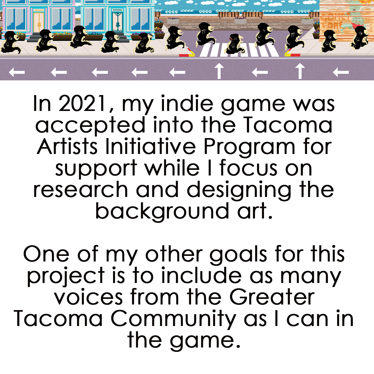 I’m grateful to the Tacoma Arts Commission for supporting this part of the game research process through the Tacoma Artist Initiative Program (TAIP). You can learn about other TAIP projects by clicking here.