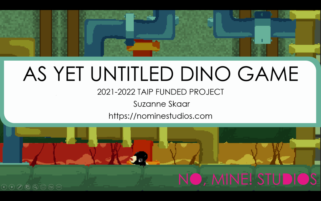 In this picture: Text: “As Yet Untitled Dino Game; 2021-2022 TAIP Funded Project; Suzanne Skaar.” Background art: screen capture of black and white pixel art dinosaur peering over green brick wall in underground environment. Different colored pipes form networks throughout the foreground and background of the picture. Pink No, Mine! Studios logo is in the bottom right corner.
