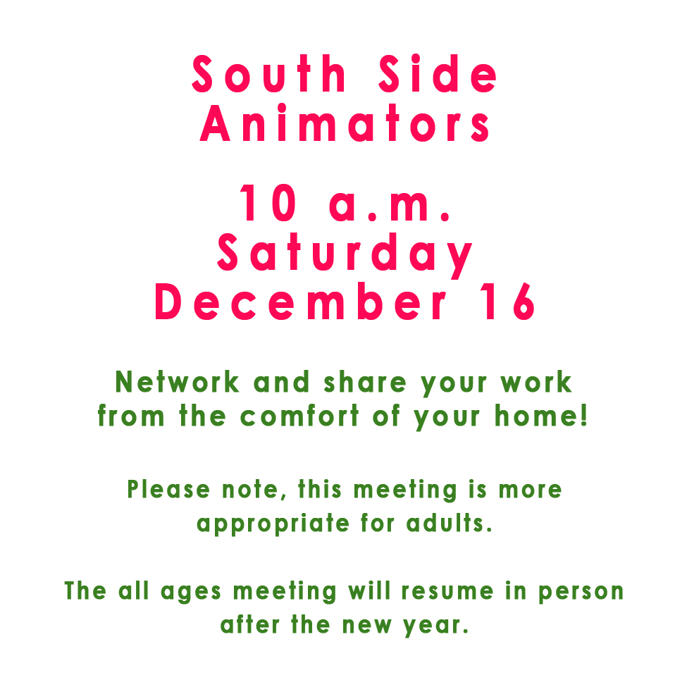 In not-so-great news, in-person animation club meetings are on indefinite hold. My car decided it no longer wants to shift out of first gear, and the lack of a working vehicle has made hosting the free in-person animation club meetings too daunting a task given the amount of equipment and supplies that need to be moved back and forth. I’m holding out hope that this will be figured out by Springtime. (If anyone wants to donate a Vespa with a cargo rack, or a more practical working vehicle to the studio, now would be the time.) The next virtual Animators meeting be in February; the registration link will go live in early January. Pre-registration is required, but the online meetup is free.