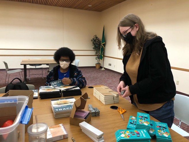 No, Mine! Studios Interns Jillian and Sterling helping assemble the South Side Animation Club Animation Kits at the Tacoma Public Library Moore Branch.