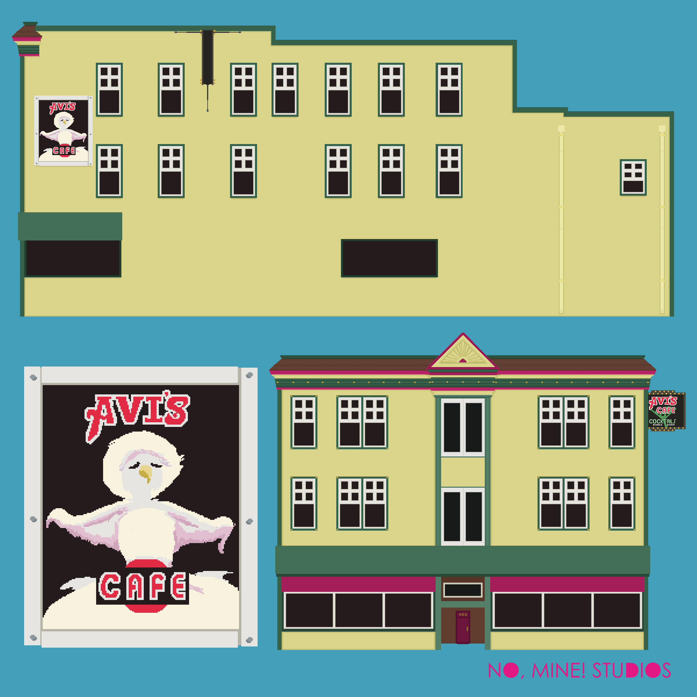 A challenge with drawing from historical references for this game has been to not be too literal in the design process. I’ve taken some liberties with background art design for the purpose of keeping with the game’s overall style. For example, looking at my illustration and the historical photo of Rex Theatre side by side, it’s easy to see that my version is a little taller and less rounded on the top than the original. Another difference is that while the original theater had 650 seats, I don’t think 650 dinosaurs could fit into the original theater.