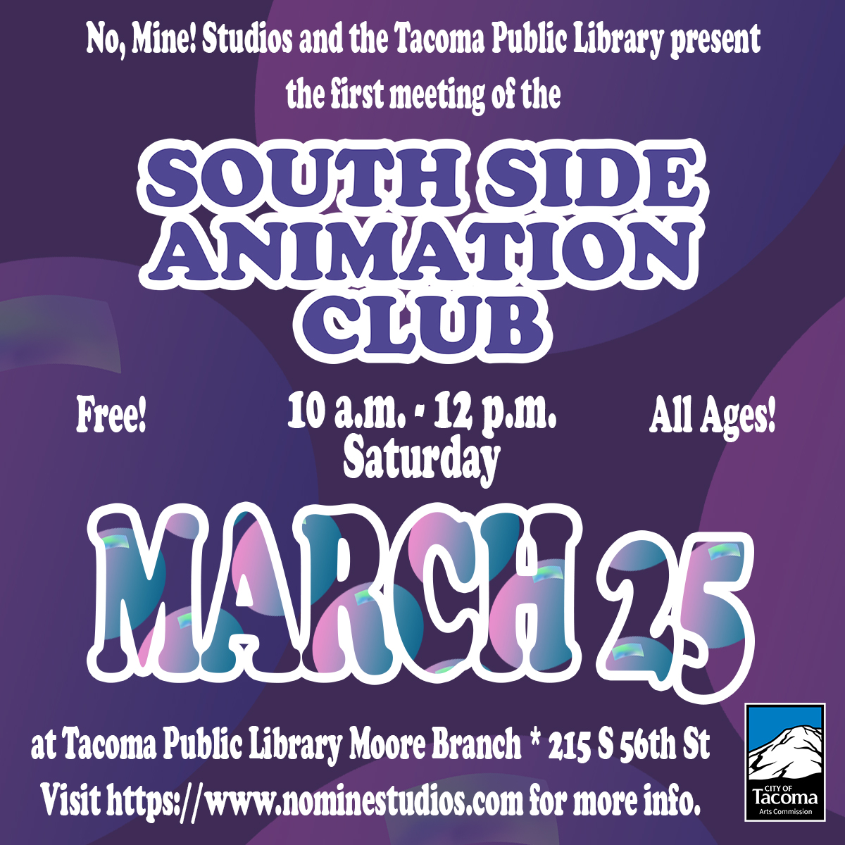 Join the South Side Animation Club at Tacoma Public Library Moore Branch (215 S 56th St) on Saturday, March 25, 2023 for our first meeting! Free and all ages. Presented by No, Mine! Studios and the Tacoma Public Library, with support from the City of Tacoma Arts Commission.